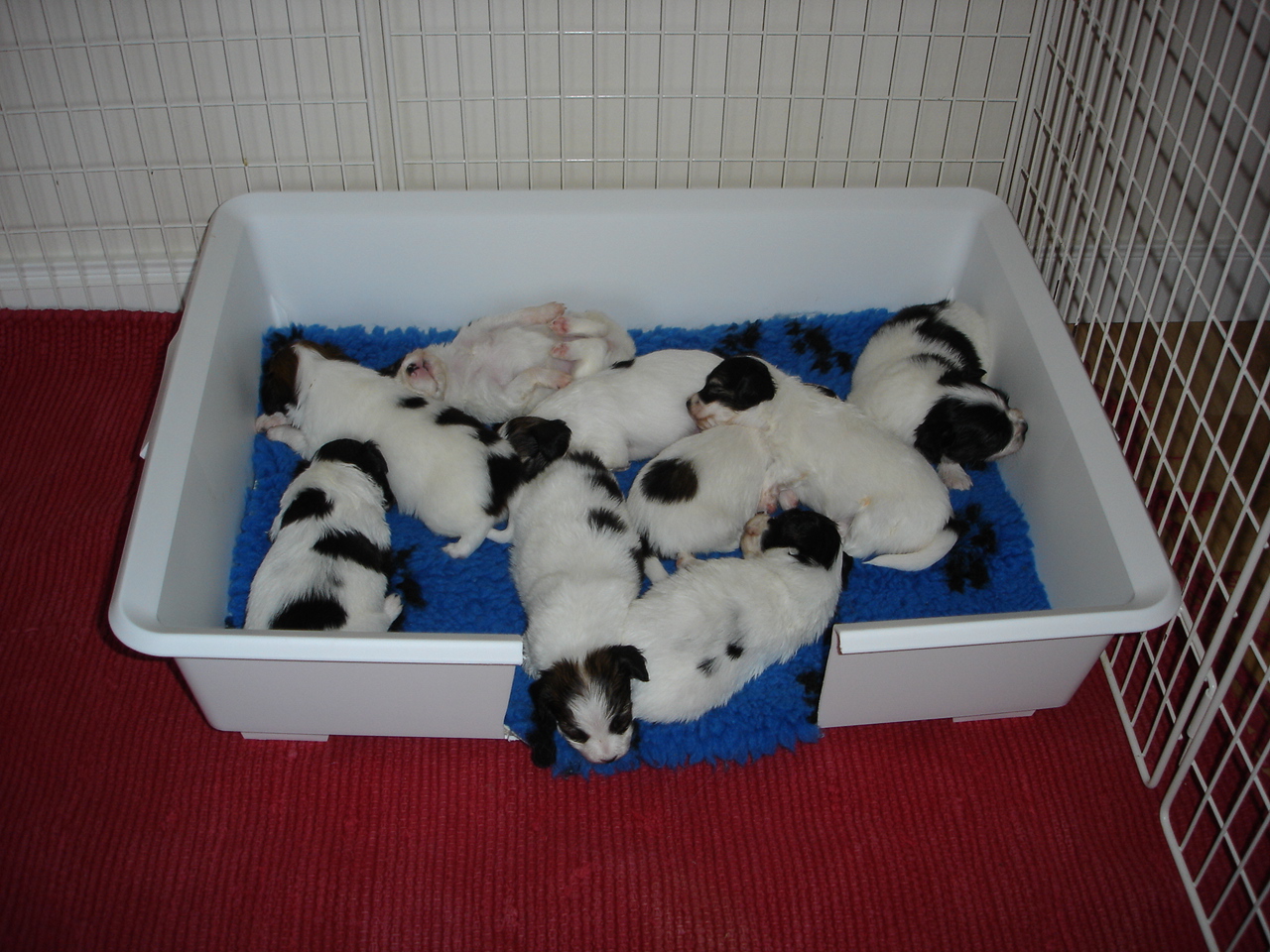Today two of our bitches, Ch Caratoots Classic Confidence (Camille) and Caratoots Charming Cassandra (Mindie), gave birth to a litter of wonderful papillon puppies each. Camille first gave birth to two gorgeous bitches and a handsome male, and a few hours later Mindie had a fantastic litter of six beautiful bitches and one striking boy.